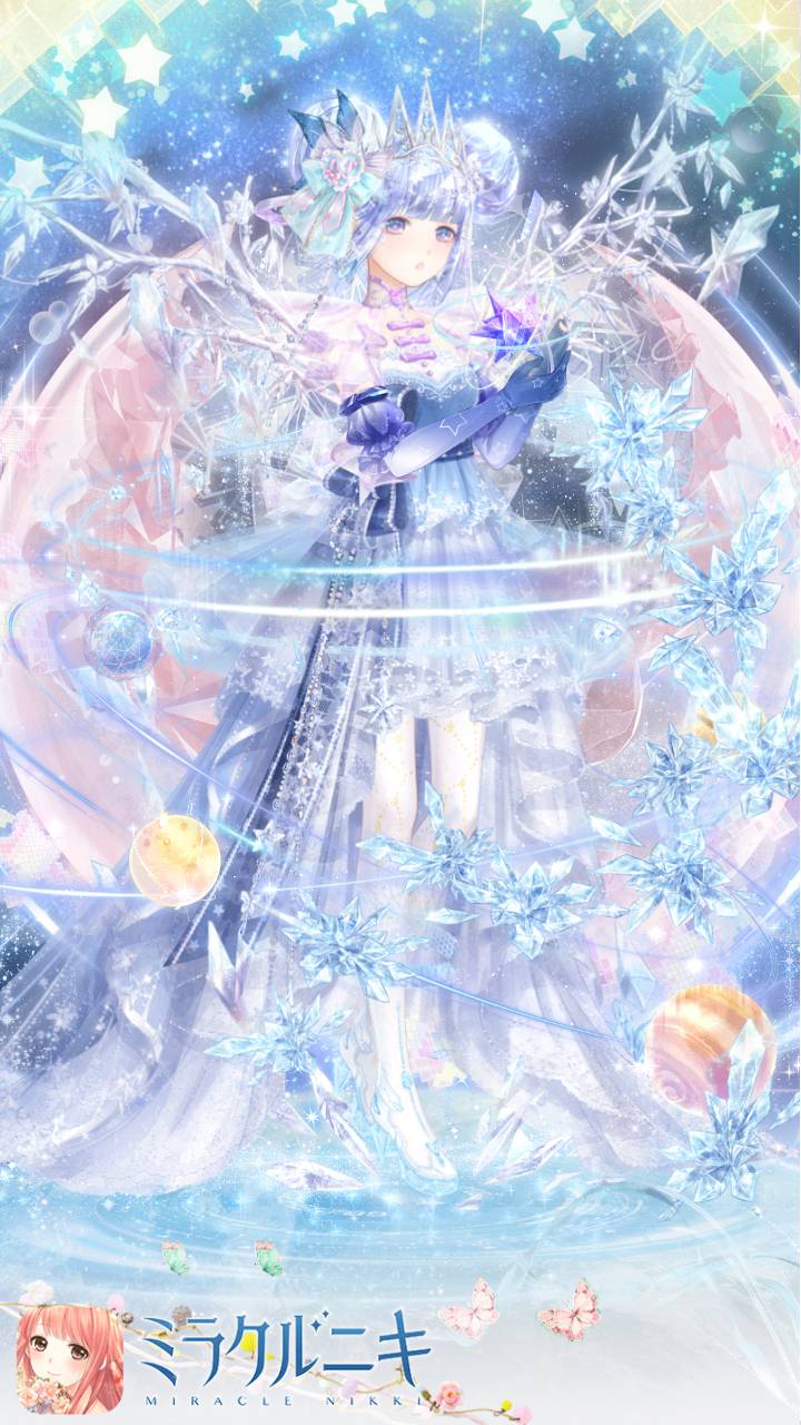 水晶・氷をコンセプトとした幻想的なコーディネート。羽根も髪も水晶のように透き通った輝きを放っているかようにきらきらとしているものをチョイス。