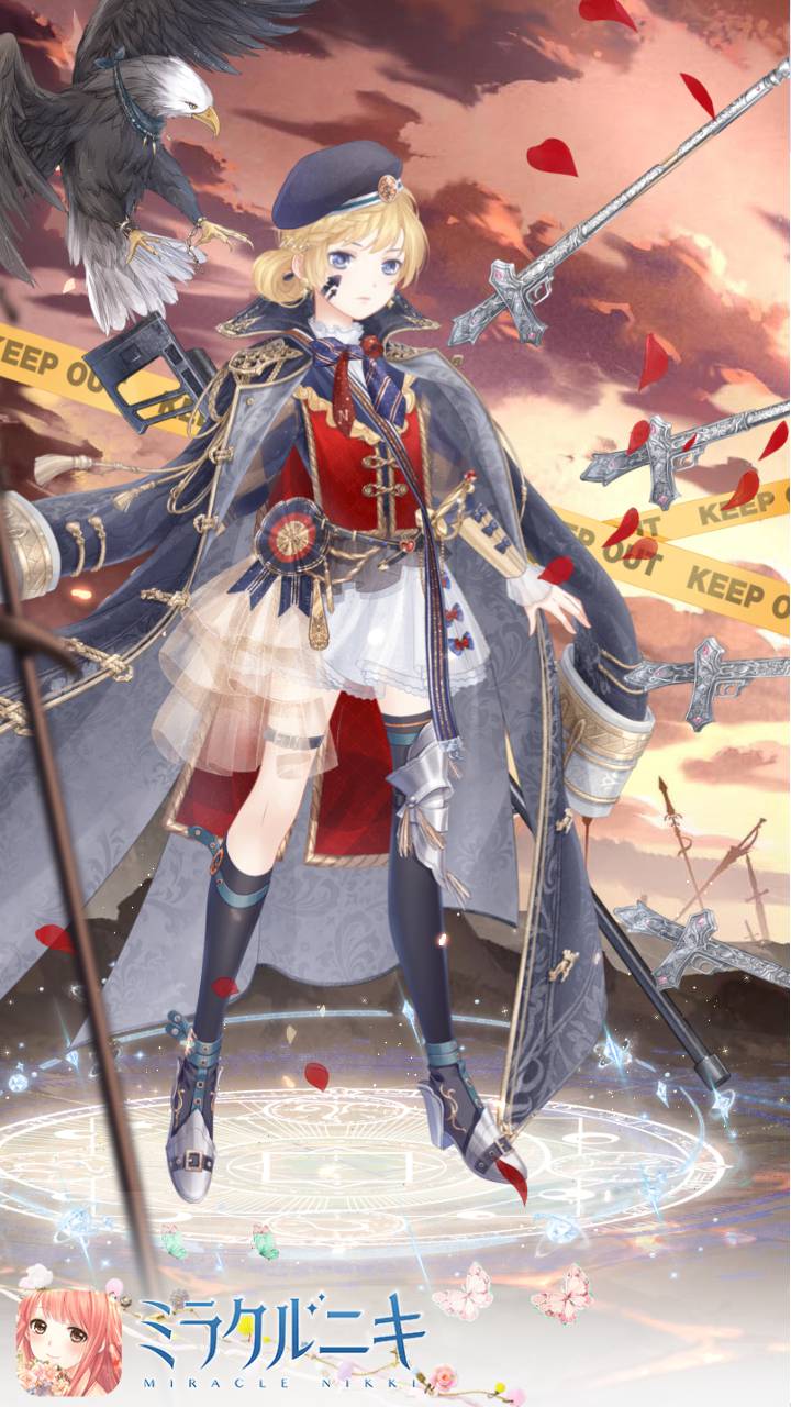 武器を召喚して戦う女の子軍人というコンセプトのコーディネート。少女なので服装は可愛く、でも軍人なのでゴツいアウターを着させてます。