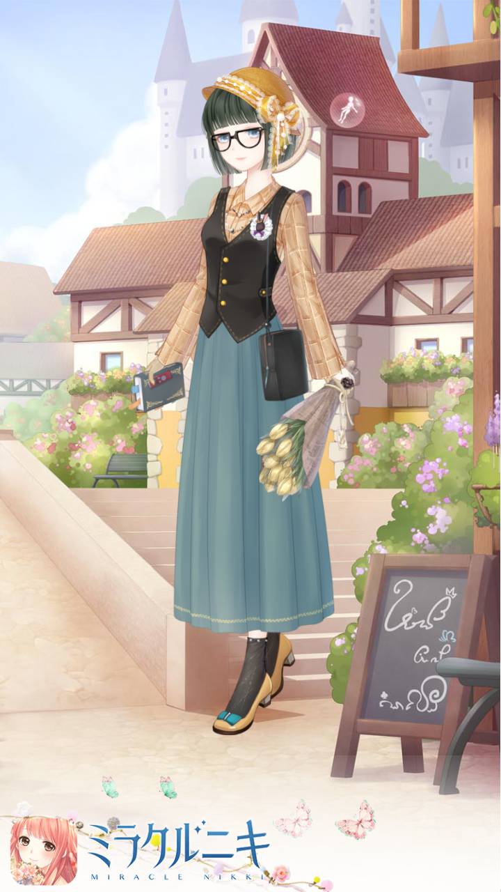 エプロンのリボンに合わせて服の色は青緑に。