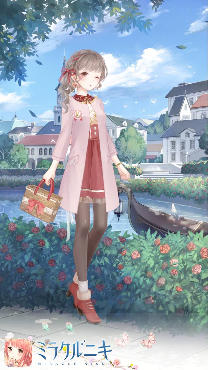 淡い赤と桃色のアイテムでコーディネート。大人に憧れて背伸びしてる感じに。