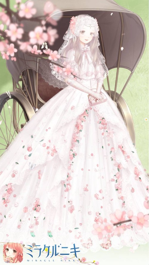 桃色の花に囲まれたウェディングコーデ。髪色と衣装の雰囲気がかなり合ってて好き。