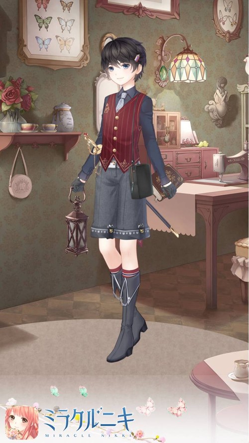 グレーと赤を基調とした男の子コーディネート。騎士養成学校の生徒というイメージ。