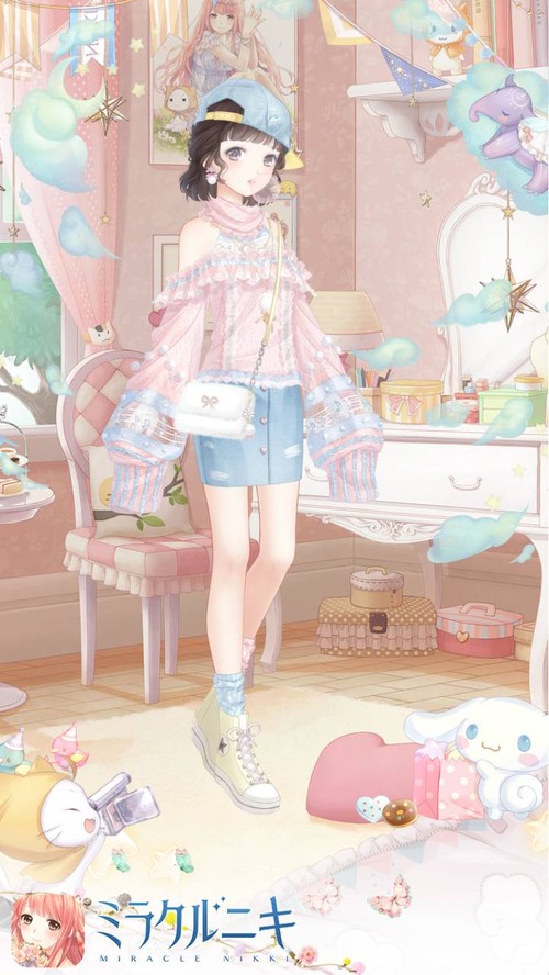 淡い桃・水色でコーディネート。80sレトロポップ意識。デニムアイテムを使うとそれっぽいかもしれない。
