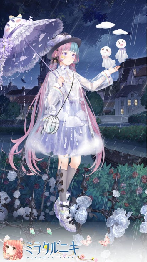 レインコートを使ったコーディネート。白・藤色の服にアクセントとして黒リボンを使ってます。
