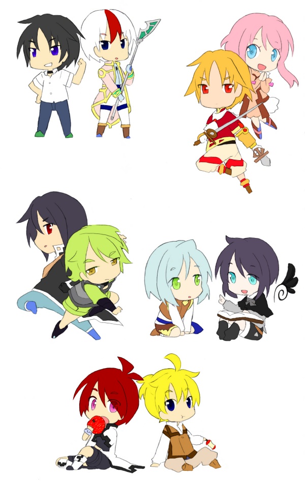 以前描いたイメージミニキャラよりラフに主人公をふたりずつ描いていこうのふたつめ。 中段左の肉体派は今でもお気に入りです。