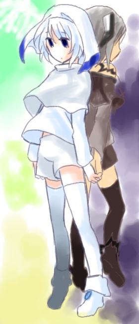 雰囲気がとても気に入っている絵です。 乃祈と夜稚は敵対関係でデザインも色が対照的になるようにしてるのでただ並べるだけでいい感じになります。