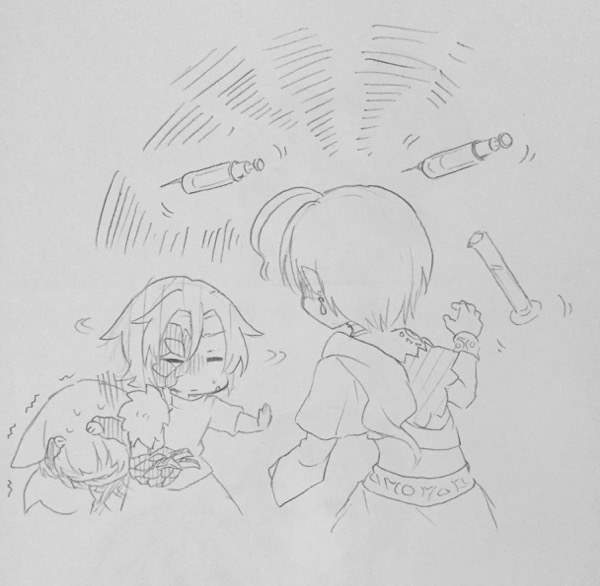 イタズラをして怒られ実験体にされる袮狐を庇ってる図。