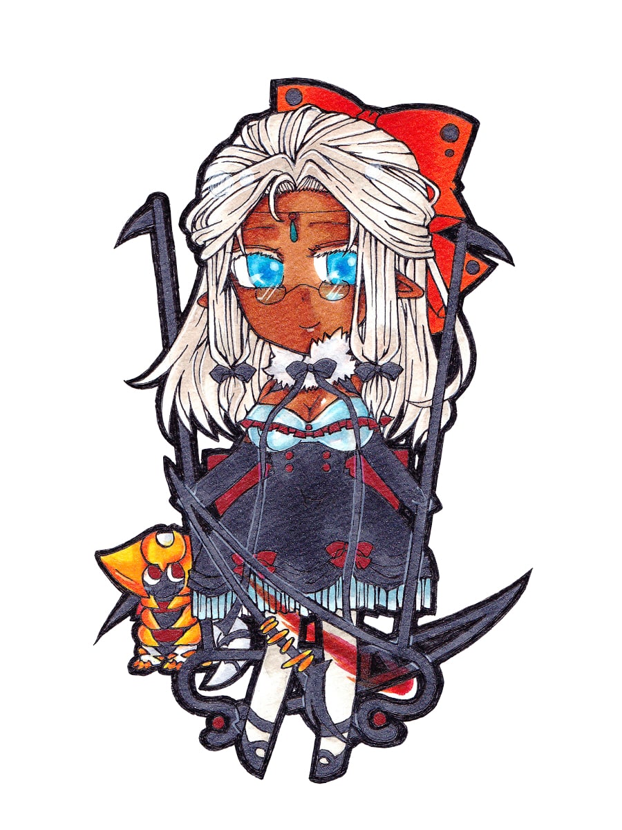 失われた文明から造られた黒い二双鎌が武器。姫千代の意志に反して動くこともある。ねっぷう・むしのさざめき・かえんぐるま・どくどくがデフォルト技。姫千代よりも彼女を護衛している周りのデスカーンやシンボラーが戦うため、滅多に戦うことはない。鎌に毒を仕込んだり、刀身に炎を纏わせて戦う。守備タイプ。