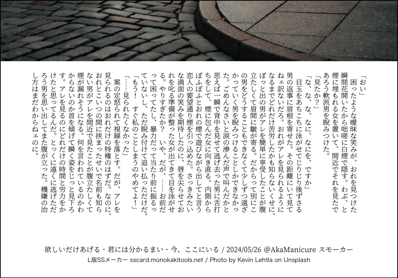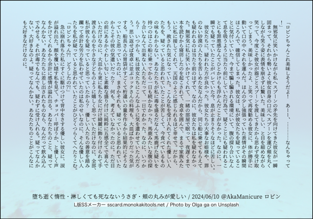 全部のお題を使えなくてもいい。書くのに飽きたら話が中途半端だろうとそこで強制終了。な適当ルールの文章練習あそび。(