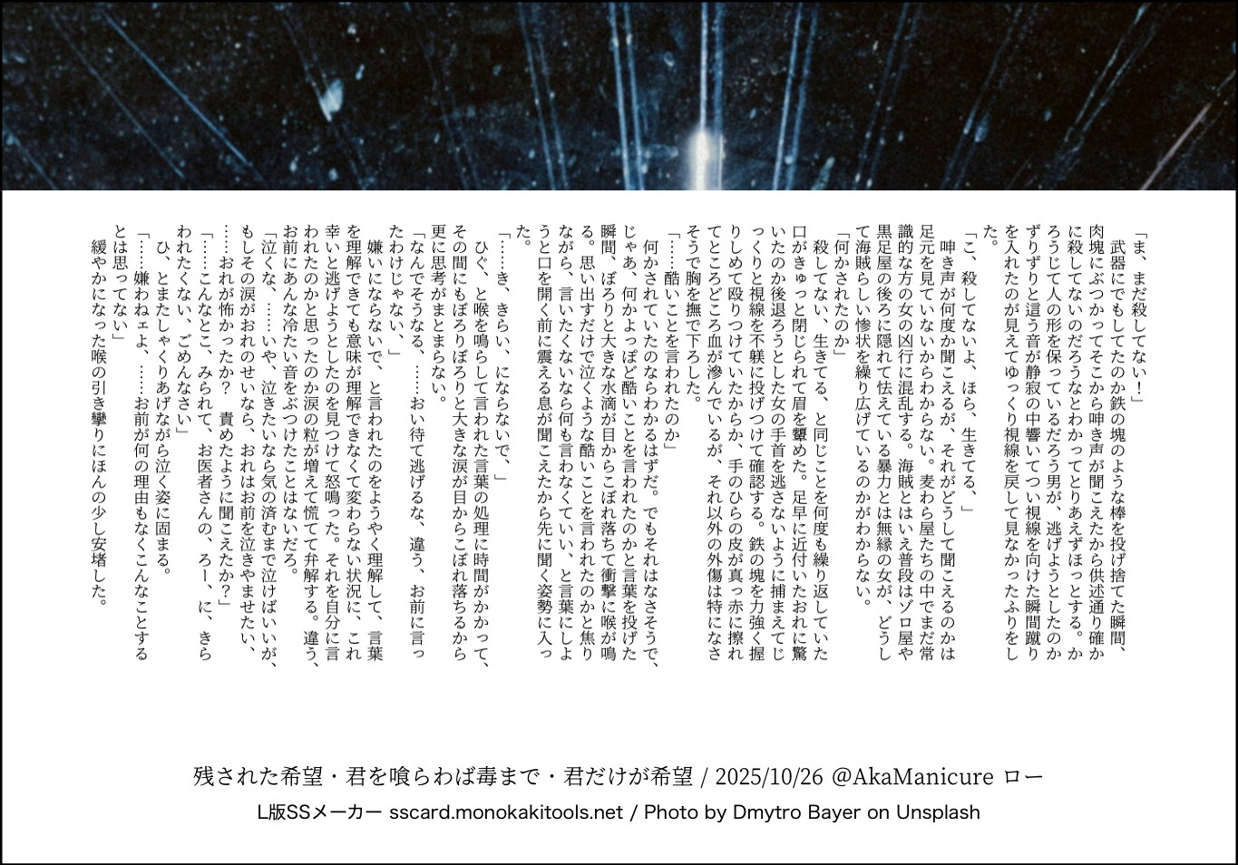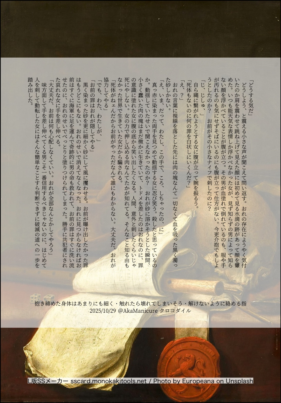 全部のお題を使えなくてもいい。書くのに飽きたら話が中途半端だろうとそこで強制終了。な適当ルールの文章練習あそび。(