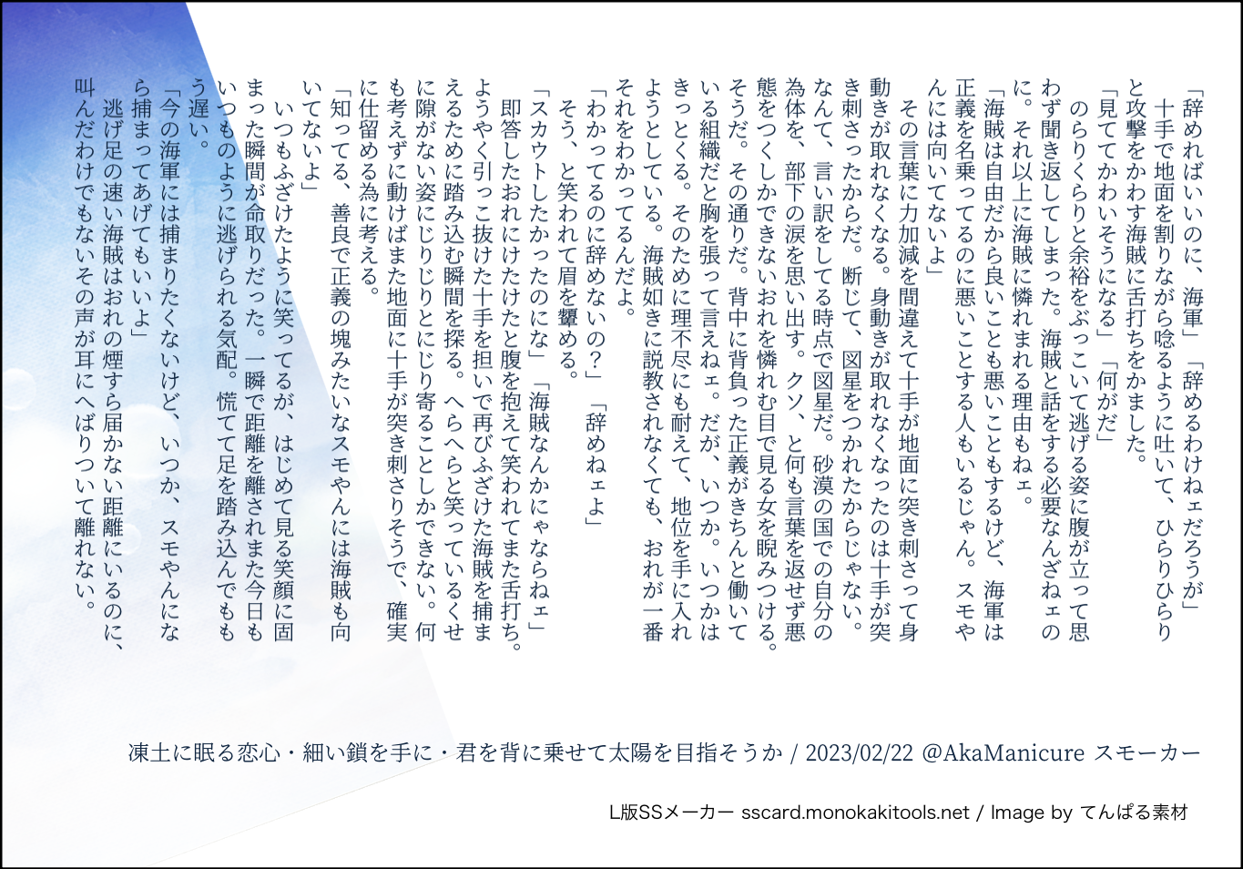 全部のお題を使えなくてもいい。書くのに飽きたら話が中途半端だろうとそこで強制終了。な適当ルールの文章練習あそび。(