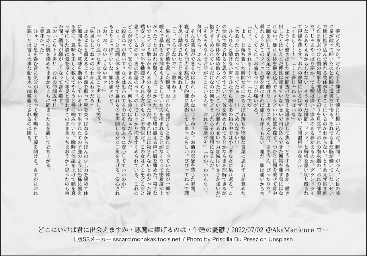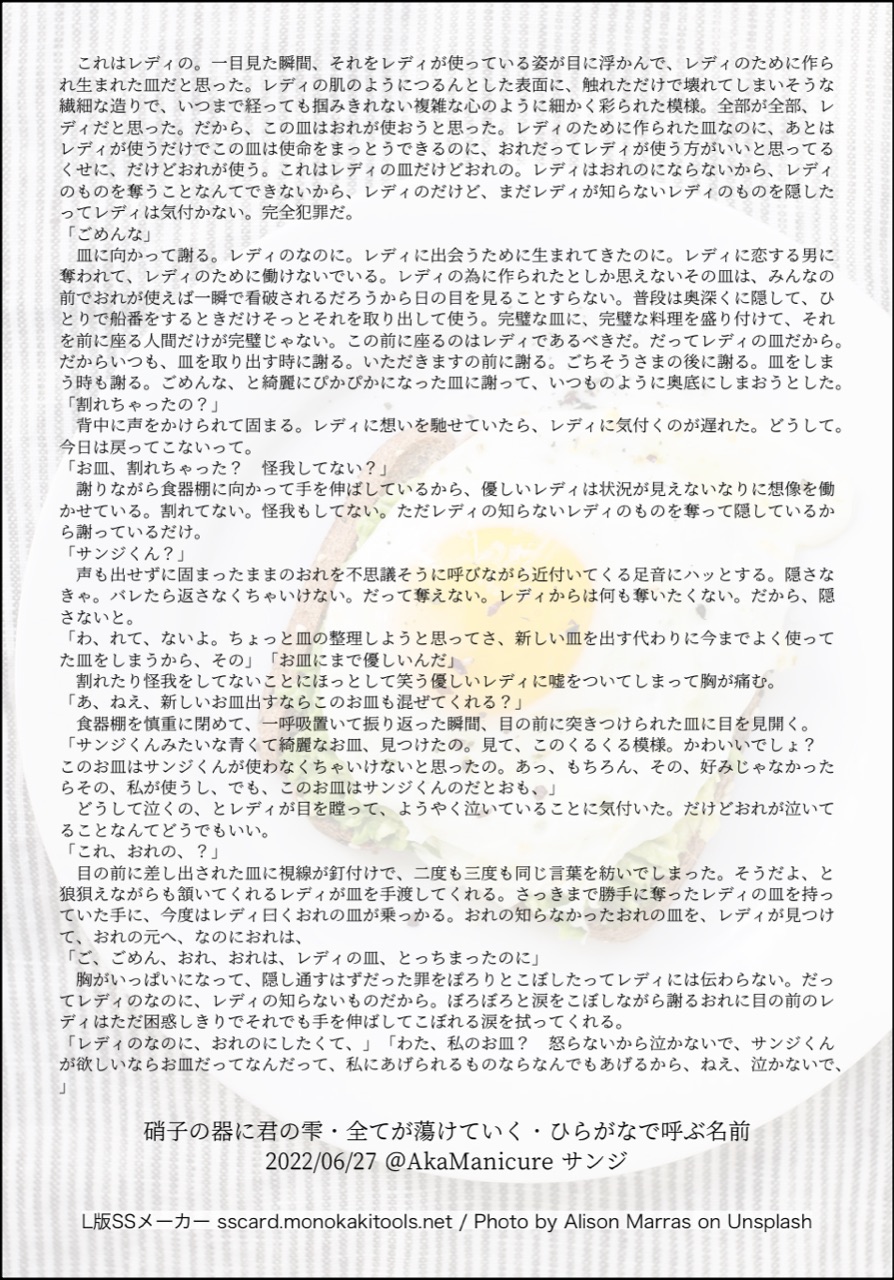 全部のお題を使えなくてもいい。書くのに飽きたら話が中途半端だろうとそこで強制終了。な適当ルールの文章練習あそび。(