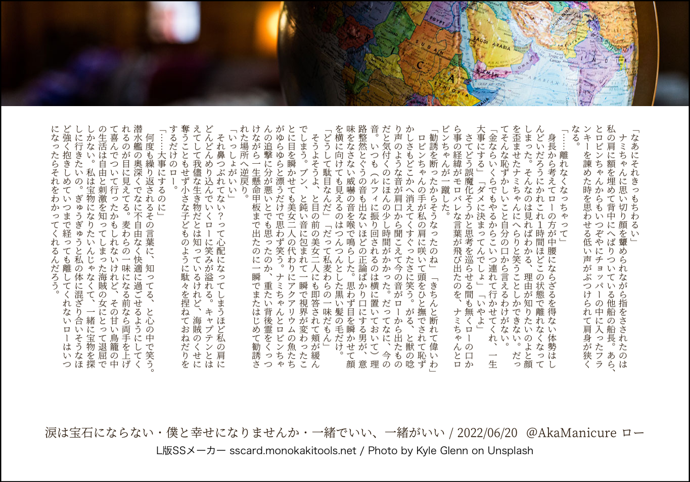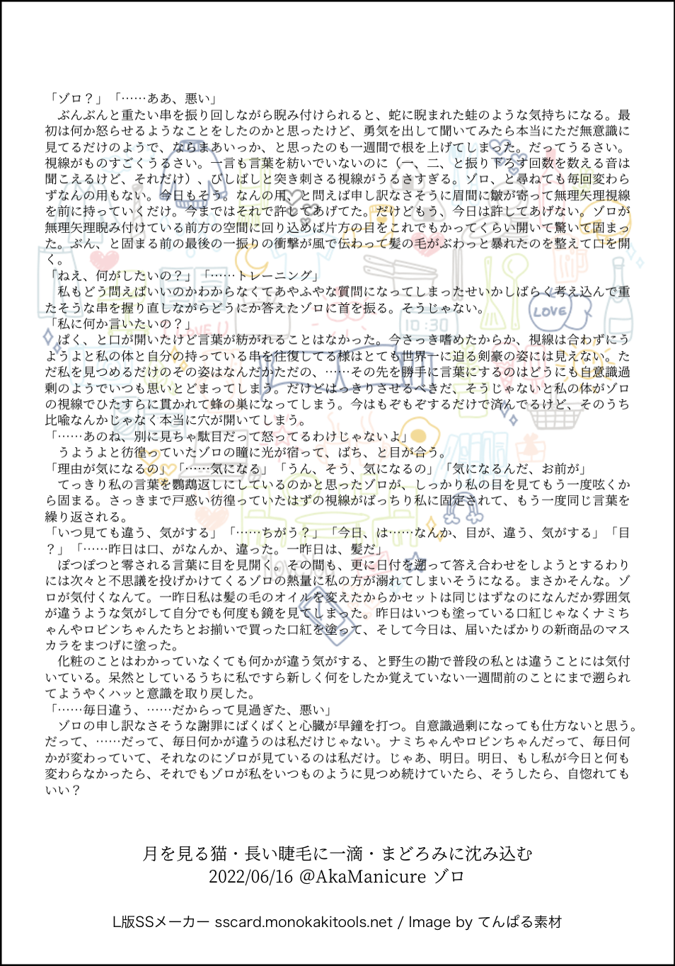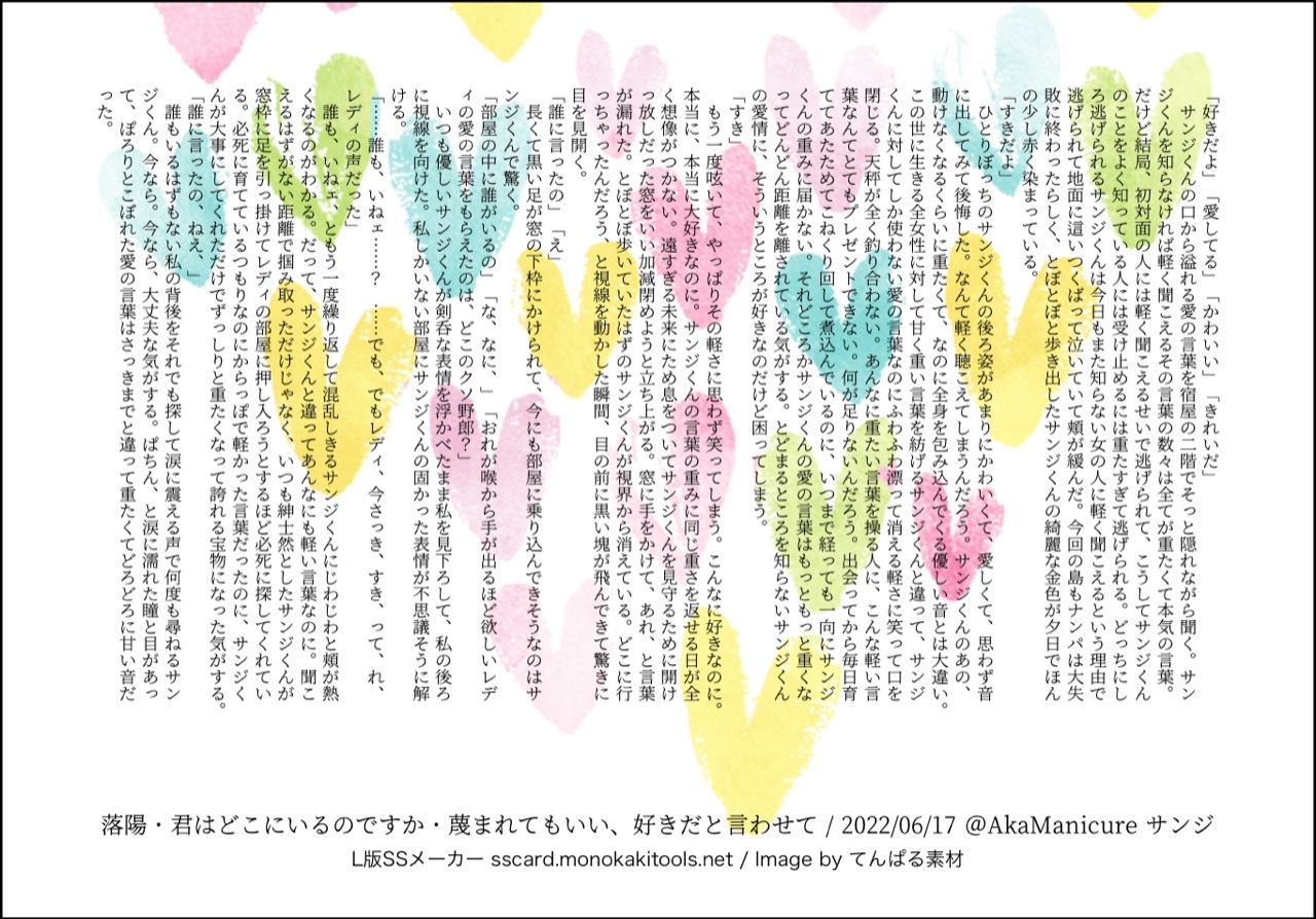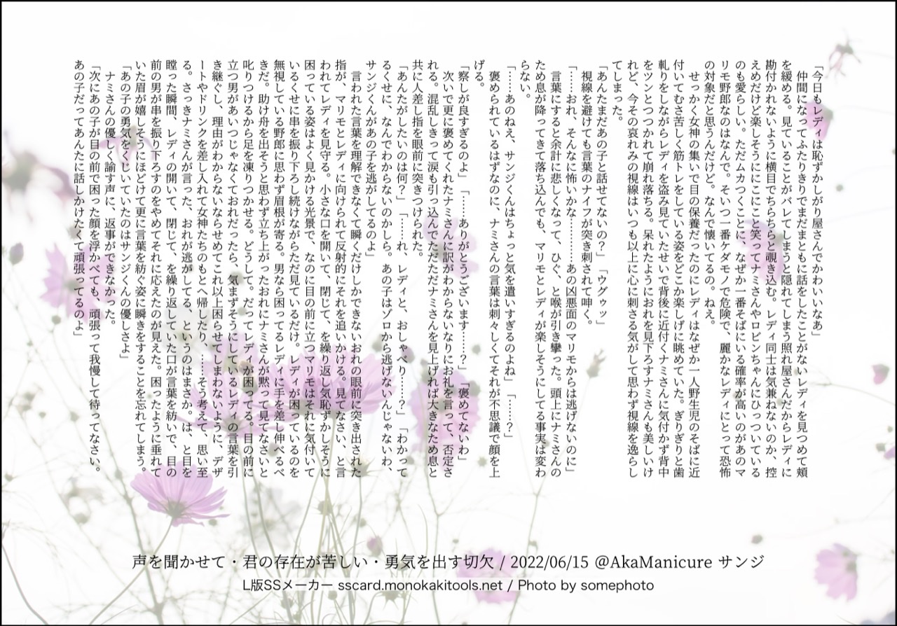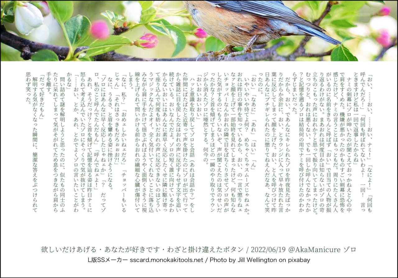 全部のお題を使えなくてもいい。書くのに飽きたら話が中途半端だろうとそこで強制終了。な適当ルールの文章練習あそび。(