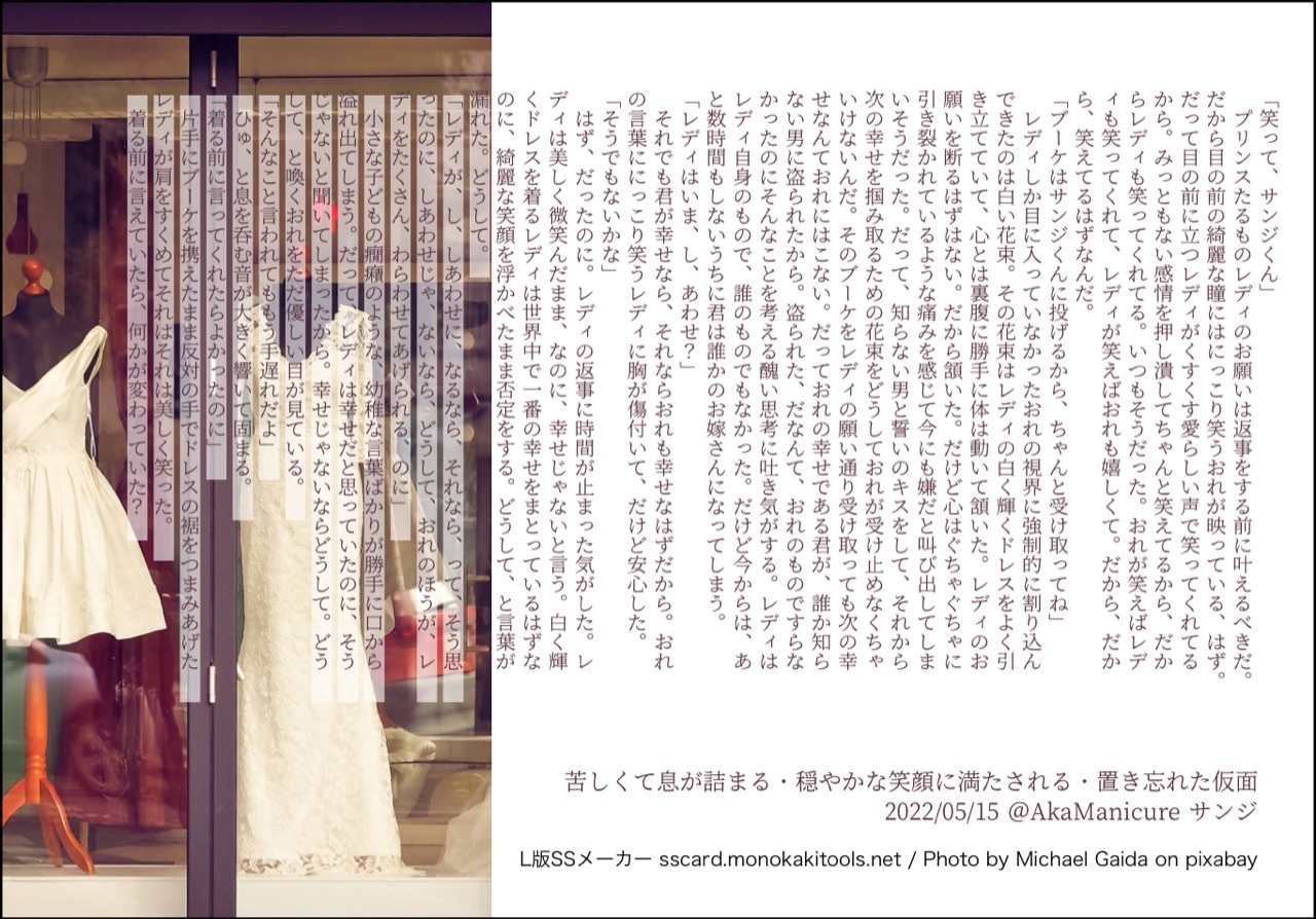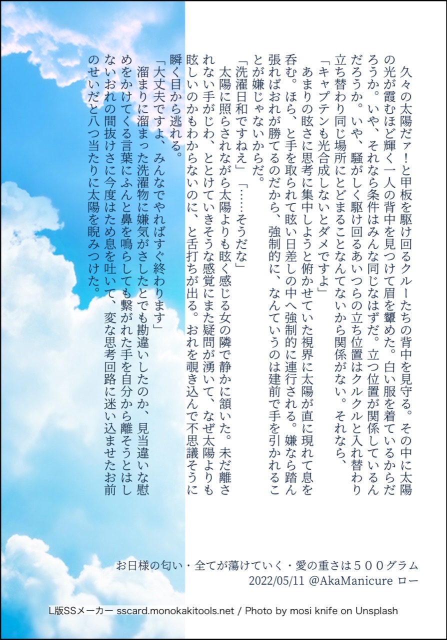 全部のお題を使えなくてもいい。書くのに飽きたら話が中途半端だろうとそこで強制終了。な適当ルールの文章練習あそび。(