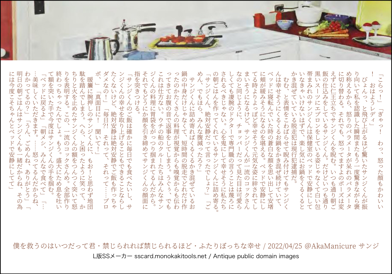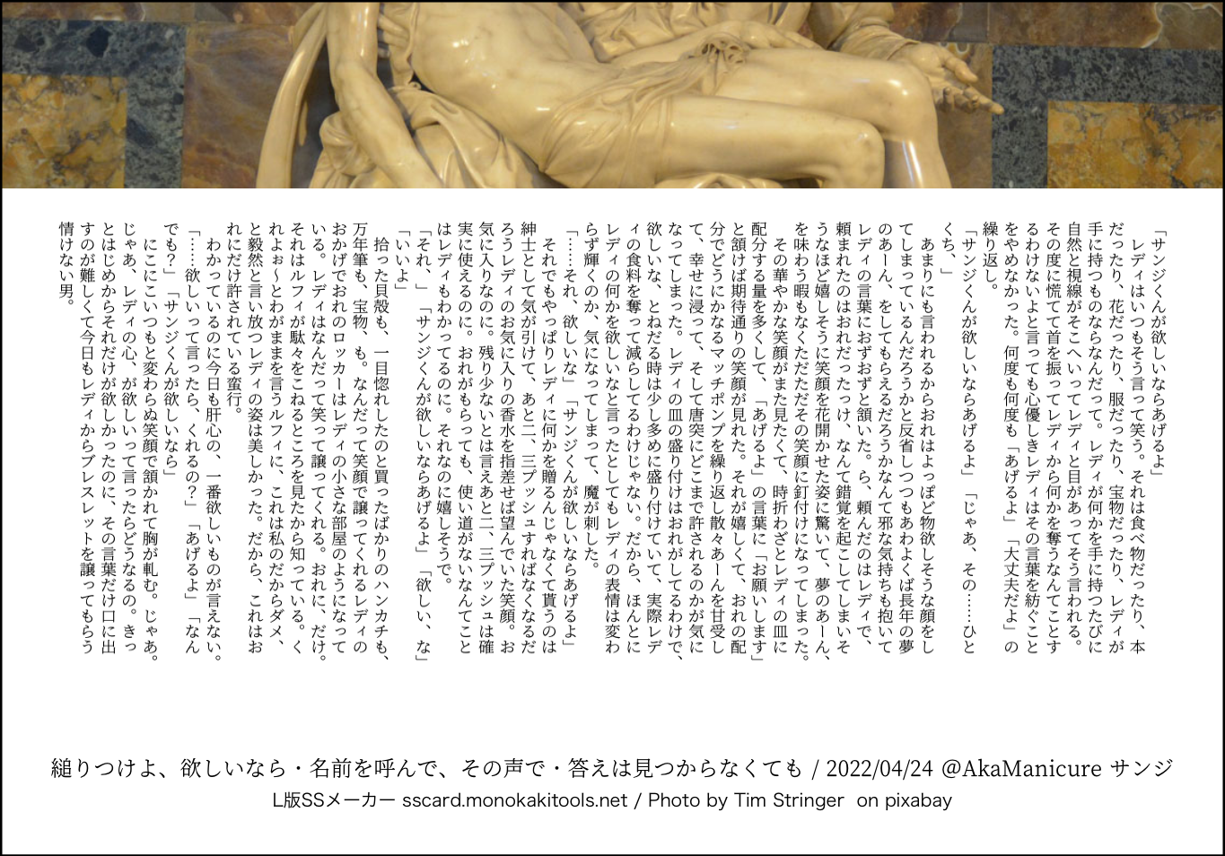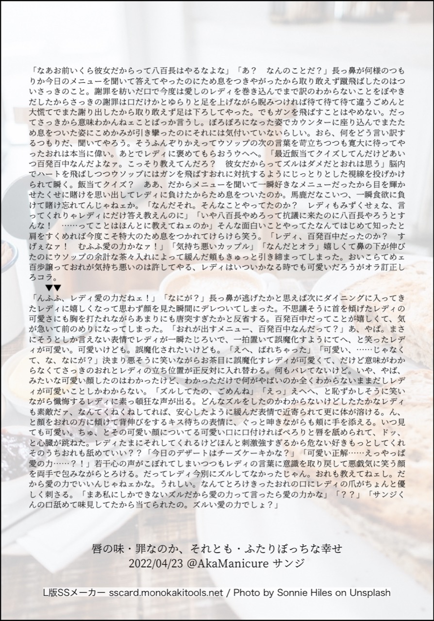 全部のお題を使えなくてもいい。書くのに飽きたら話が中途半端だろうとそこで強制終了。な適当ルールの文章練習あそび。(
