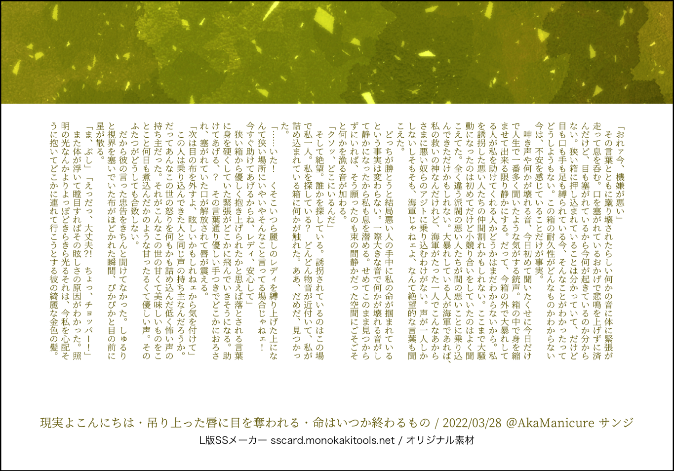全部のお題を使えなくてもいい。書くのに飽きたら話が中途半端だろうとそこで強制終了。な適当ルールの文章練習あそび。(