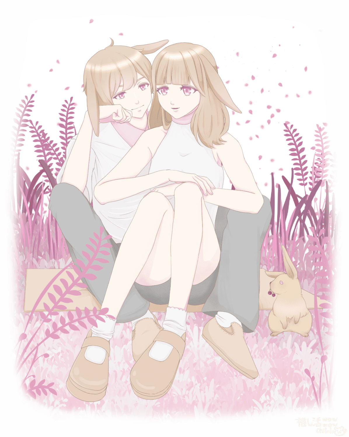 ウサミミ族 2025年07月04日 一次創作キャラです。 うさぎの耳が生えた「ウサミミ族」の男女を描きました。 他の小動物一族同様の設定があります。 甘えん坊で寂しがりな性格の多い一族です。 ちなみに、密着度高いですがカップルではありません。