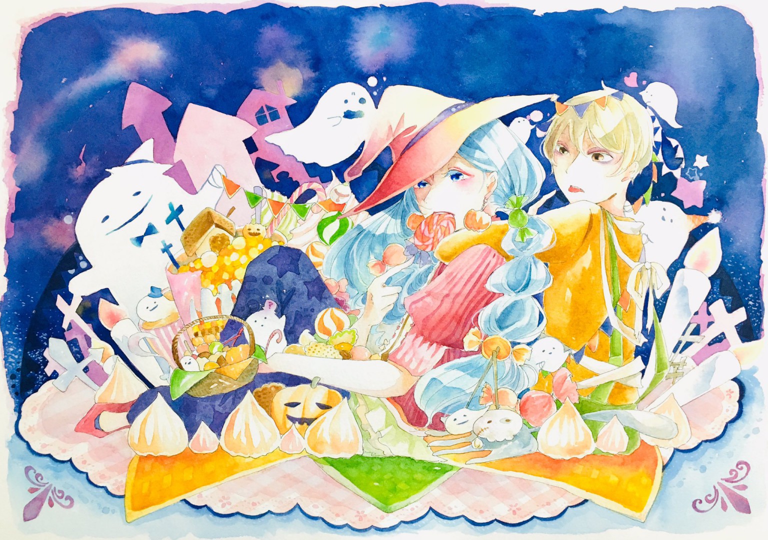 全然サイトにアップするのが間に合っていない、遅ればせながらのハロウィンイラストです〜 おばけ様方をいかに可愛く描くかに尽力した…笑 後から見直すと、アッここ塗ってねえなっていう場所がぼちぼちあって切ない気持ちになる一枚です