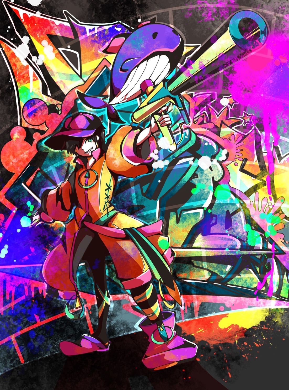 とりあえずごん太線画とビビッドカラーでストリート系のイラストを描きたかったんだけど、慣れてない感と消し切れない奏汰の絵感。