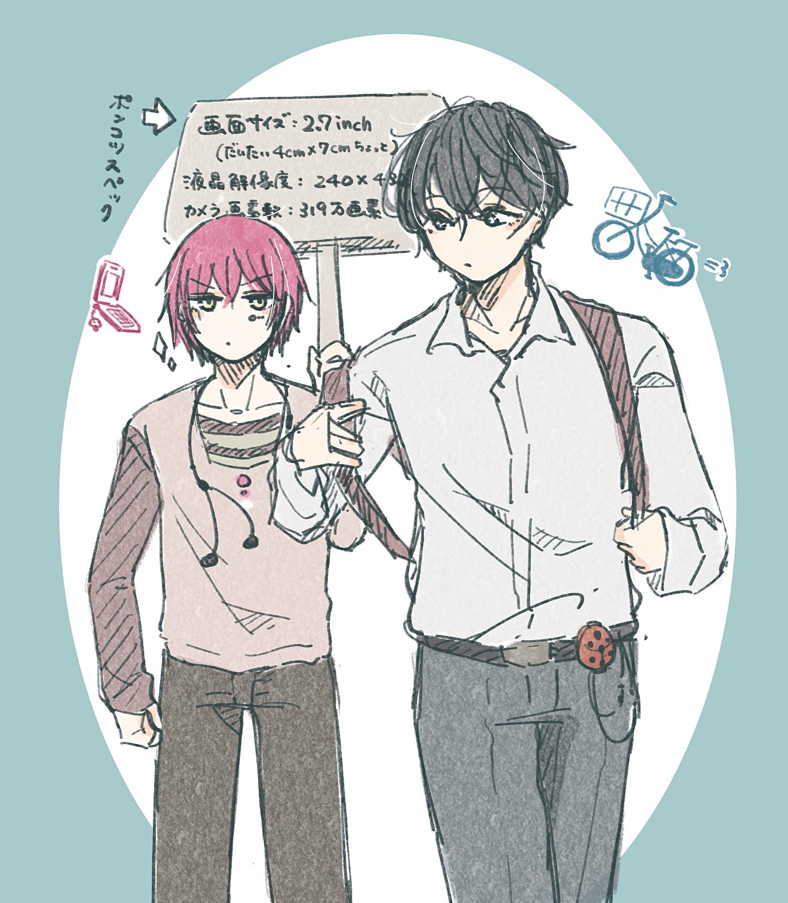 もんのすごい懐かしい子たち。 高校の時に書いてた自分のガラケーとチャリの擬人化である。 昔の絵かなんかを整理してたらこの子たちの絵が出てきたので、気晴らしに描いてみた落書きです。