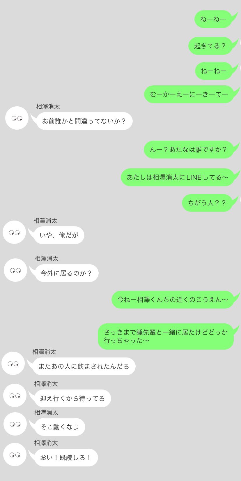 その後LINEに既読が付くことはなく公園まで着いた相澤くん。ベンチにでも座っているだろうとベンチを見に行っても見当たらず暗くなっている周りを見渡すとブランコの下で何かがモゾモゾと動くのが分かった。見に行くとブランコから落ちたのか好きな子ちゃんが砂の上で気持ちよさそうに眠っていた。「おい、起きろ。おい!」好きな子ちゃんの頬をぺちぺちと軽く叩きながら起こすと『あれぇ~?相澤くんがいるぅ~』と上半身を起こしぼーっとしていたと思えば座り込んで両手を広げこちらを見上げる好きな子ちゃん。「なんだ?」と、ぎょっとした顔で見おろす相澤くんに悪魔の囁き『だっこして~』とへにゃりと笑う酔っ払い。はぁと深いため息を吐き仕方なくおんぶをしてやる。『だっこがいい~』と後ろで暴れているが無視を決め込む相澤くん。気付けば静かになった好きな子ちゃんがぎゅっと背中にしがみついてきて『だいすき』と小さく呟いたのを最後にすーすーと可愛い寝息が聞こえてきた。耳まで赤い相澤くんの深い深いため息が家に着くまで何度も闇に飲み込まれていった。