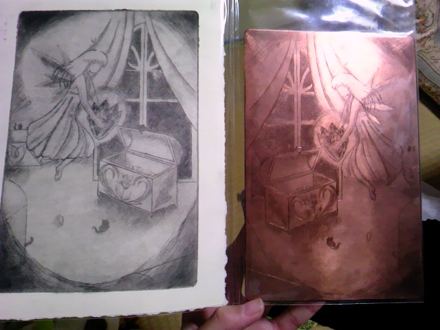 こちらは銅版画といいまして、銅板にニードルなどで傷をつけ、インクを流し込んで刷る技法です。