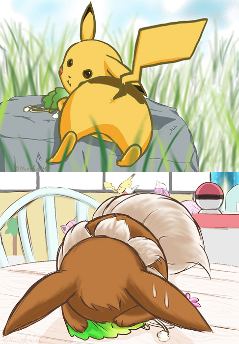 (移転前掲載日:2019/07/25)新しいポケモンのタイトル「レッツGO ピカチュウ/イーブイ」が発売された際に描いた絵です。自分は購入できなかったのですが、友人からギフトみたいな機能があると聞いて、こんな感じで作ってたらかわいいなあ、と思って描いた二場面です。