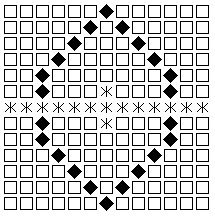 点対称、線対称どちらも満たした図形。そして六部屋、等しいマスの数と、用意された石全てを使用している。