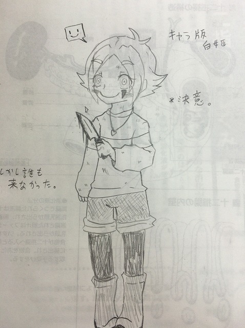 医学のプリントに落書きしたフリスク&キャラコスプレの白姫ちゃん。