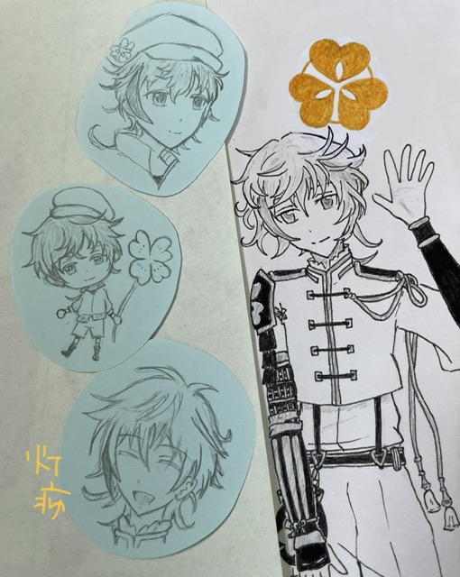 物吉貞宗「刀剣乱舞を知らなかったけど リク消化で調べて描いてる件」 家紋を間違えて描いてしまい、後から別紙を貼った子です。 髪の毛ふわふわ可愛い。この子が居ると幸運が訪れるそうです。身内の所に投下したい(笑)2023/04/18