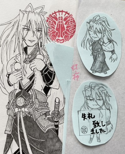 千子村正「刀剣乱舞を知らなかったけど リク消化で調べて描いてる件」 ミニキャラのみ。 そして、、うん。ごめんない…。 これ描くしかないよなーと、、、。 ただドヤ顔描きたかっただけなんですけどね。「失礼致しました」に描いてある家紋は蜻蛉切さんのです。2023/05/18